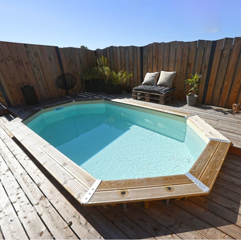 Holzpool Ubbink Azura 750 x 400 achteckige Form. Lieferung als komplettes Kit inklusive Struktur, Filtration und Zubehör.