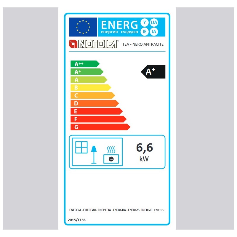 Der Nordica Extraflame Tea 6,6kW Holzofen aus anthrazitschwarz emailliertem Stahl. Mit einer Nennleistung von 6,6 kW, die ca. 189m3 heizen kann.
