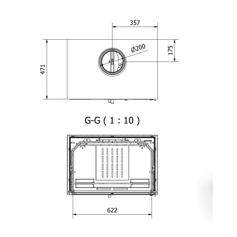 Primärluft: Er befindet sich an der Unterseite des Geräts. Unsere Geräte ermöglichen es Ihnen, diesen Lufteinlass einzustellen, je nachdem, ob Sie mehr oder weniger Flamme wünschen, wodurch der Verbrauch von Holzscheiten reduziert wird, um eine effizientere Verbrennung zu erzielen