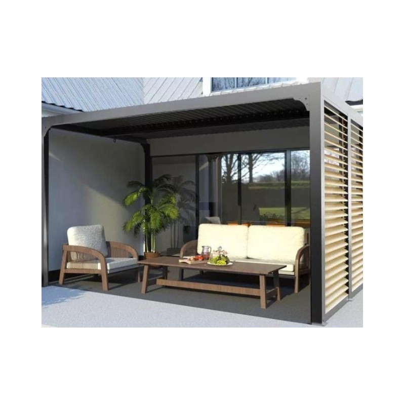 Um Ihren Komfort zu optimieren, ist die Bioklimatische Pergola ist mit einem Satz von 2 Seitenwänden mit abnehmbaren Saugnäpfen für eine der Seiten von 3 m aus Aluminium-Holzimitat ausgestattet.