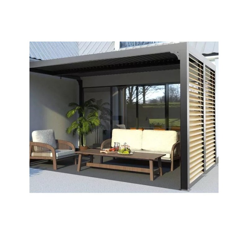Das Dach der Laube besteht aus 78 verstellbaren schwarzen Aluminiumlamellen. Sie öffnen und schließen manuell und gleichzeitig mit einer Kurbel. Sie können sich um bis zu 90° öffnen, um die Helligkeit und Wärme unter der Pergola einfach zu steuern.