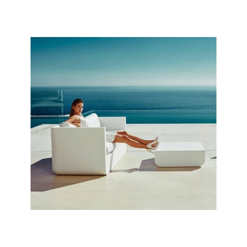 Gartenmöbel Ulm de Vondom bestehend aus einem Sofa, einem Sessel und einem ultramodernen Couchtisch mit klaren Linien für Innen und Außen.