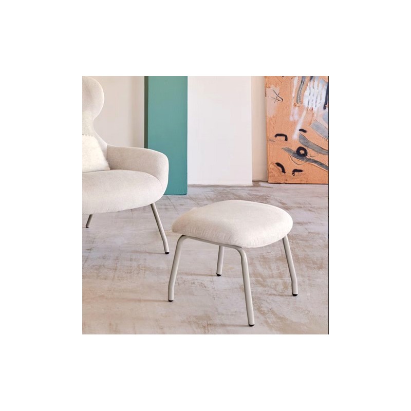 Die Fußstütze für den Sessel Lina aus beigem Chenille-Stoff und Stahlfuß schwarz.