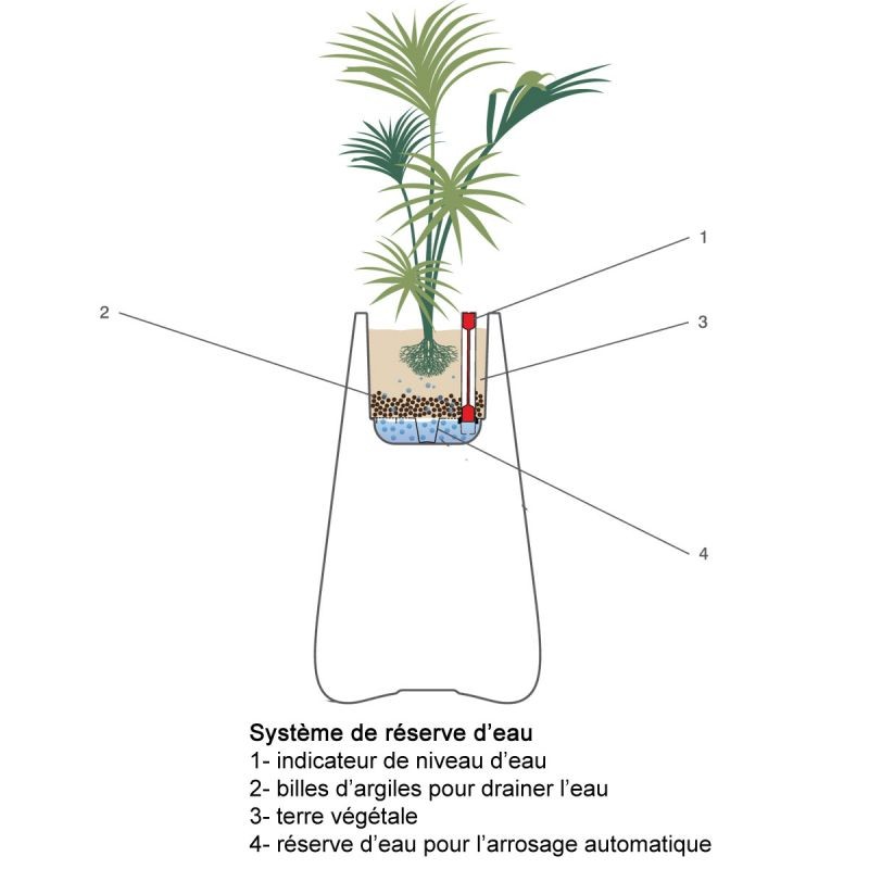 - in 5 Versionen: einfach doppelwandig, doppelwandig mit Selbstbewässerungssystem (Autonomie bis zu 3 Monaten), glänzend lackiert, hell (Kompaktleuchtstofflampe), LED (7 Beleuchtungsfarben, die über eine mitgelieferte Fernbedienung gesteuert werden).