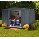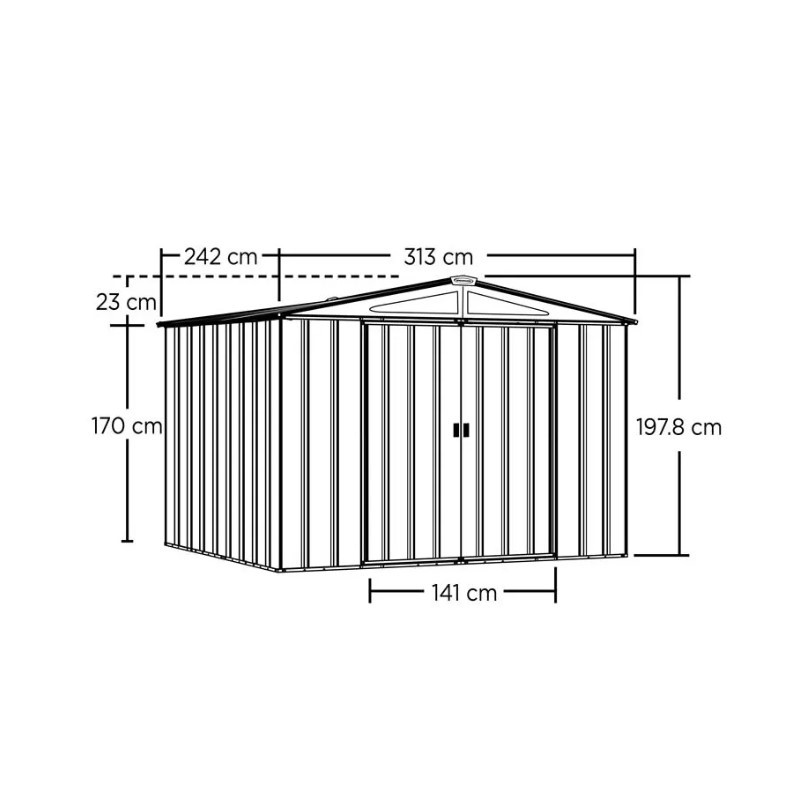 Das Metall-Gartenhaus Habrita 7,57m2 zur Aufbewahrung Ihrer Werkzeuge. Dank seiner Doppeltür von 141 cm, die den Durchgang von sperrigen Produkten erleichtert, bietet er eine bequeme Zugänglichkeit für einen einfachen Ein- und Ausstieg.