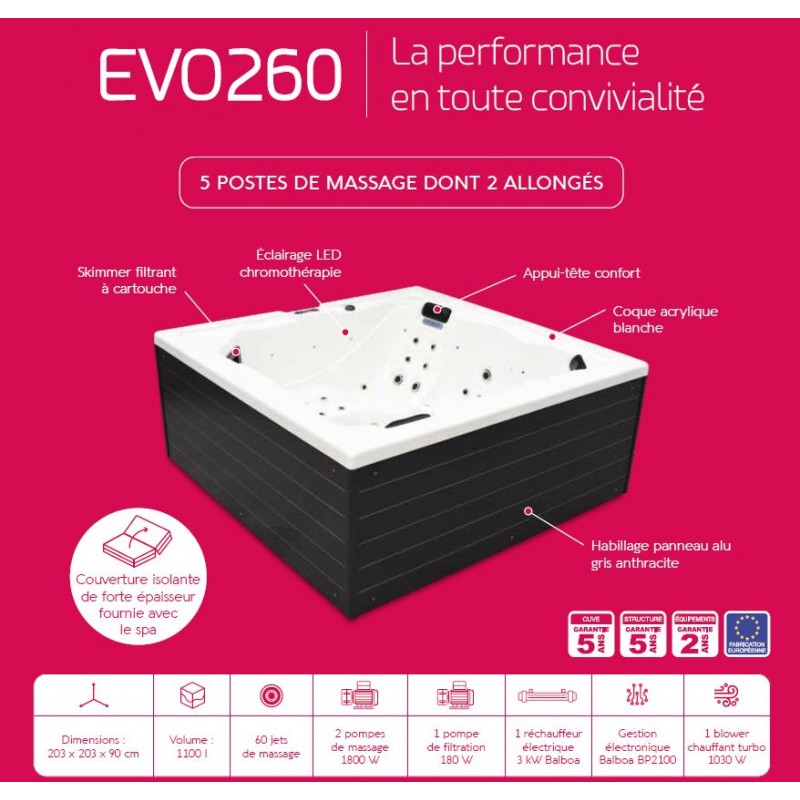 The Evolution 260 spa is equipped with 5 seats, 2 of which are ergonomic elongated, 60 massage jets.