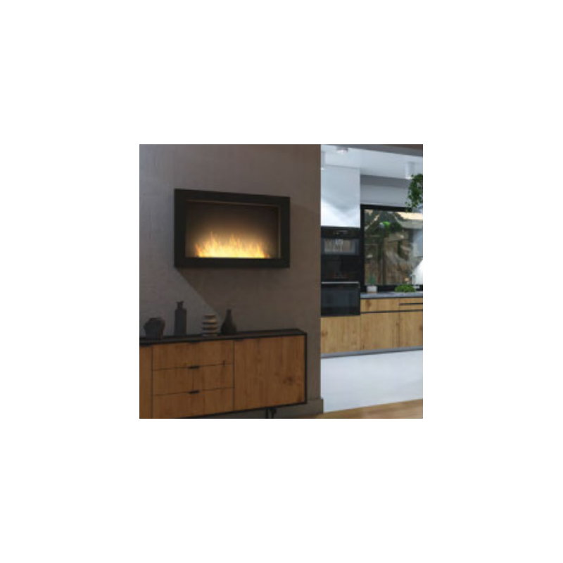 The Murall 800 bioethanol fireplace, without duct with 1 pane of glass, can be installed suspended from the wall.