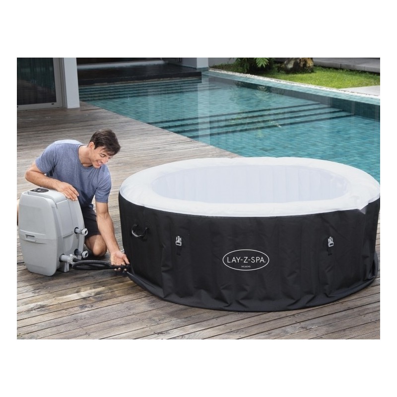 Enjoy a moment of relaxation in this round inflatable spa Lay-Z-Spa® Miami. Ideal to accommodate from 2 to 4 people, its 120 Airjet™ will put you in perfect conditions to relax from head to toe. Our Lay-Z-Spa® Miami round inflatable spa has its own insulating cover, cartridge filtration and a Chemconnect™ diffuser to keep water clean and healthy.