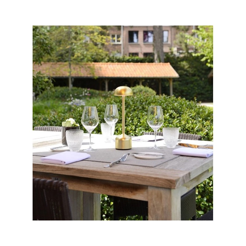 Indoor/outdoor LED lamp available in a rechargeable high version of the Demoiselle collection published by Imagilights, composed of a brushed ionized aluminum structure and a Dome lampshade decorated with a diffuser.