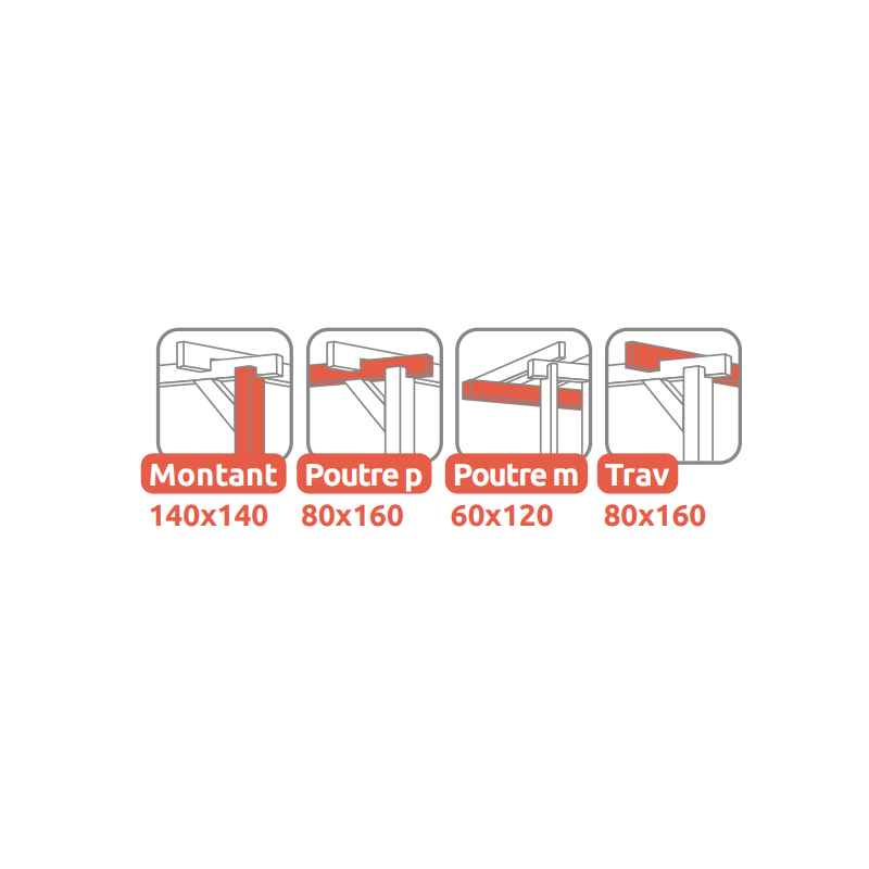 The pergola Sevilla is based on 2 poles of 14 x 14 cm with a cross-section providing good stability to the structure and includes load-bearing beams, also 8 x 16 cm in cross-section, fixed by Wooden brackets.