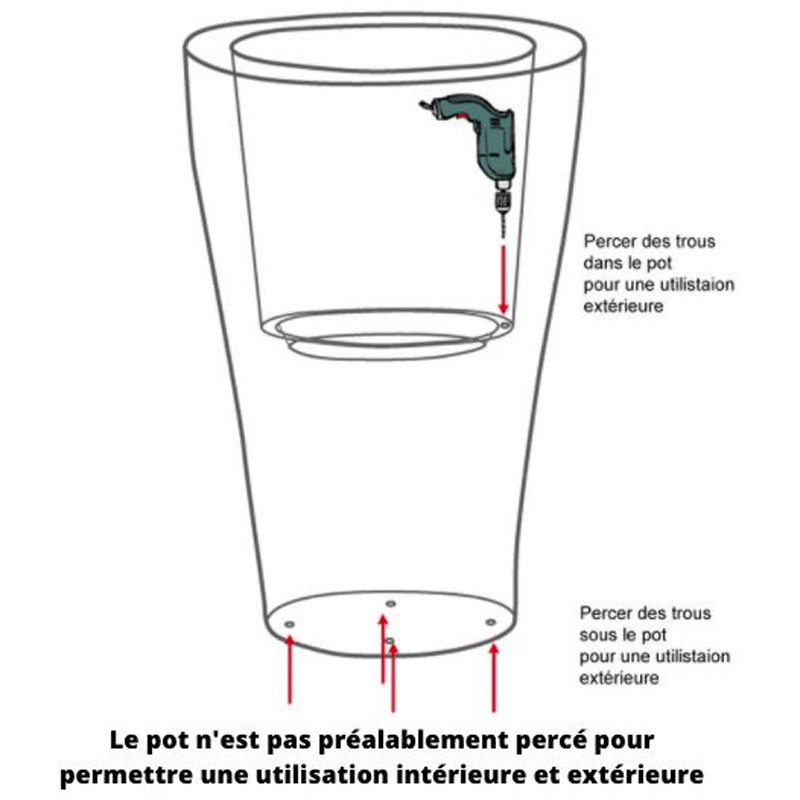 Namely: Interior dimensions of the pot: 62 x 57 x H 46 cm. Capacity: 75 liters. Suitable for indoor and outdoor use (it is enough to drill holes at the bottom of the pot to drain rainwater, when using outdoors). High UV resistance (UV8 factor: 8000 hours of sunshine in Florida). High resistance to extreme temperatures: -60°C to +80°C. High resistance to impact and deformation. Available in 14 matte colors, in 15 glossy lacquered colors, in single wall and double wall version, with water reserve, bright White Led, bright LED RGBW (multicolored lighting) with battery or electric cable power supply. Please contact us.