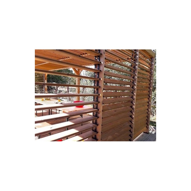 Para obtener el cierre de una pared lateral ofrecemos brisas vistas con carril despejado con listones de madera ajustables para fijar entre los postes. El sistema le permite jugar con las condiciones climáticas y el cierre para protegerse del sol con toda simplicidad al adoptar el principio de las lamas ajustables de la persiana veneciana. Este sistema está fabricado en Francia y patentado. Las cuchillas giratorias están hechas de sección de madera de 95 x 19 mm. Esto le da al sistema una resistencia al viento y una durabilidad en el tiempo que es incomparable a otros sistemas existentes.