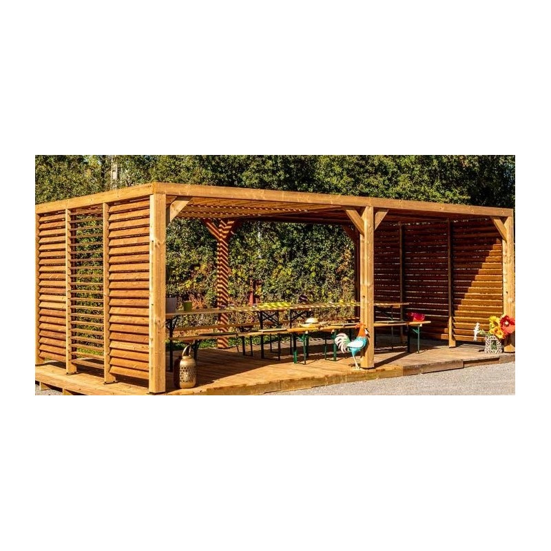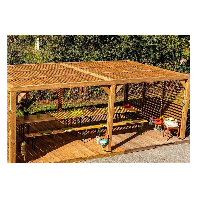 La pérgola es Hecho de abeto tratado a muy alta temperatura a 215 ° C sin ninguna adición de producto sintético. Cubre las vistas Breeze con lamas de madera THT ajustables para fijar entre los postes y obtener el cierre de las 2 paredes laterales y el techo. Las ventosas son de madera y son muy cualitativas. Son muy fáciles de instalar en la pérgola, fijándolos a los postes.