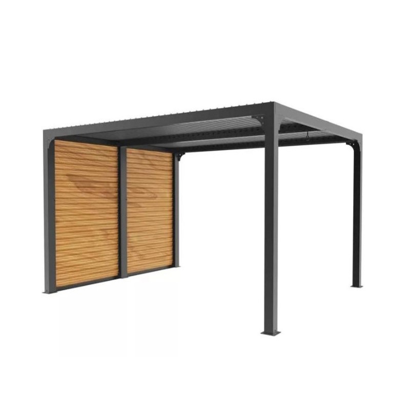 Con el fin de optimizar su comodidad, el Pérgola bioclimática Está equipado con un conjunto de 2 paneles laterales con ventosas extraíbles para uno de los lados de 3 m en imitación madera de aluminio.