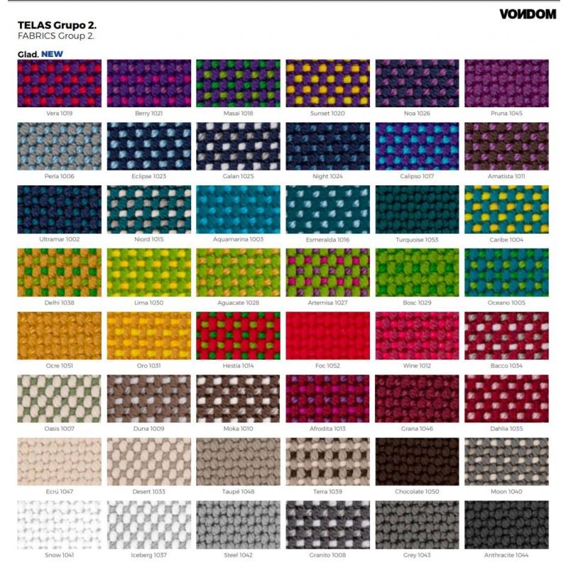 Matière : Mousse polyuréthane. Tissu Glad en polypropylène souple. Structure acier traité par cataphorèse et pieds aluminium.