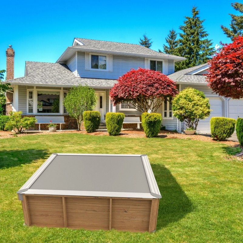 Piscinette en bois de 2 x 2m évolutive avec son système de filtration réglable de 40 à 60 cm.