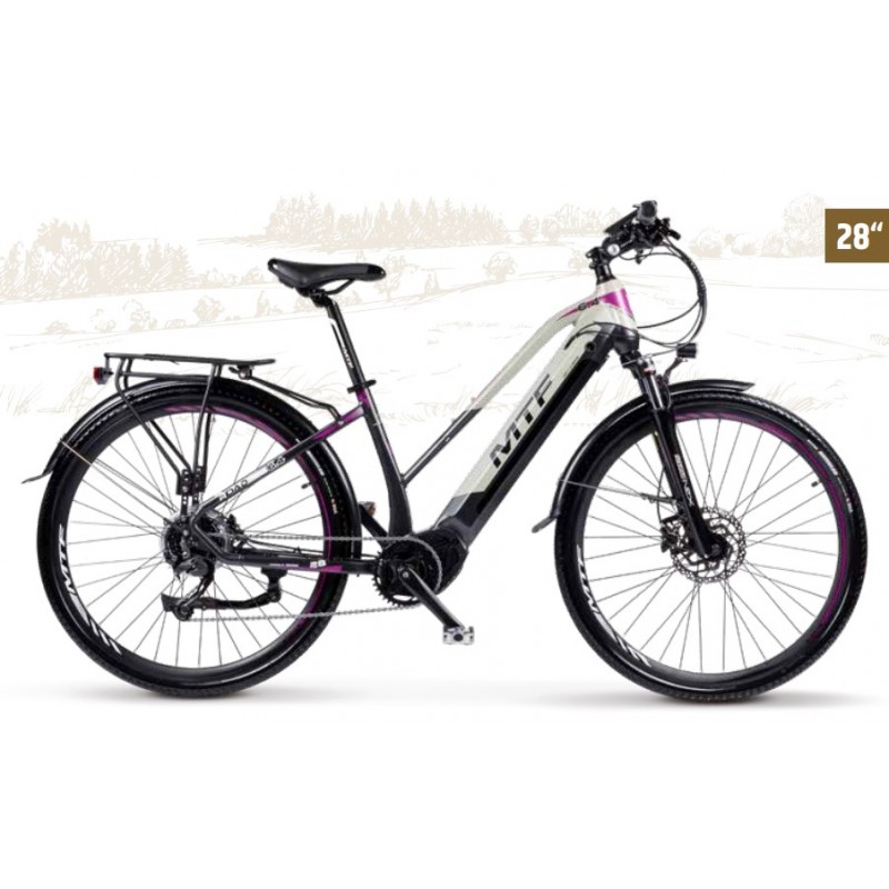 Vélo de randonnée à assistance électrique pour femme avec le tube de cadre supérieur abaissé pour faciliter l’enfourchement. Le moteur central adapté aux longs trajets sur les pistes et les routes goudronnées avec batterie intégrée Samsung et équipé d’un moteur Bafang avec une autonomie max de 160 km.