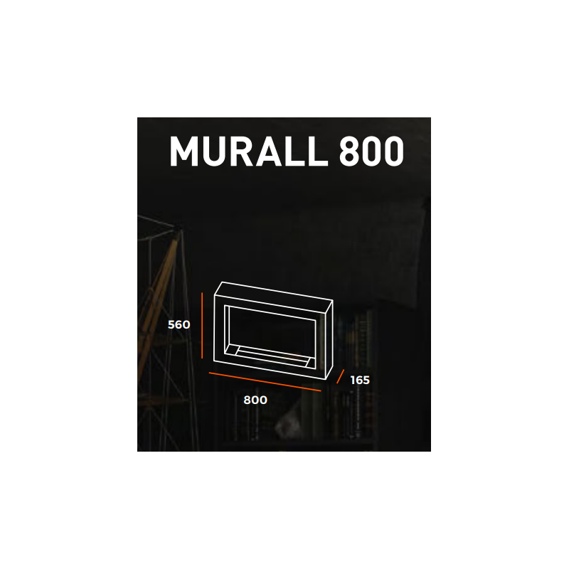 Il camino a bioetanolo Murall 800, senza condotto con 1 lastra di vetro, può essere installato sospeso alla parete.