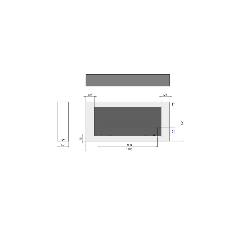 Il camino a bioetanolo Murall 1200, senza condotto con 1 finestra, può essere installato sospeso a parete.