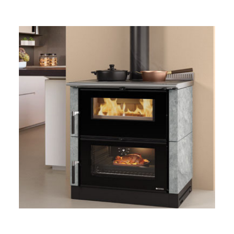 La cucina a legna Verona XXL con forno da 68 litri de La Nordica è realizzata in ghisa con rivestimento in pietra naturale.