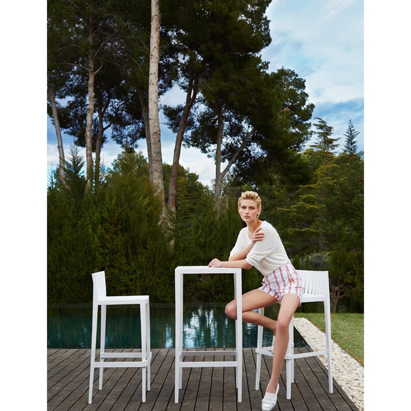 Composto da due sgabelli alti e un tavolo alto, il set da tavolo Spritz e due sgabelli ci ricordano le recinzioni in legno bianco che allineano la spiaggia.