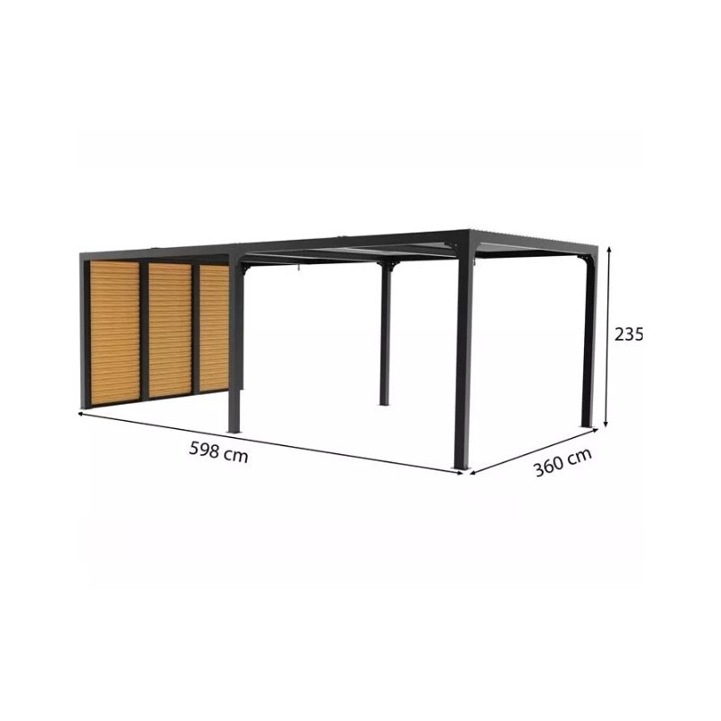 Pergola bioclimatica Habrita alluminio 21.52m2 antracite con 3 pannelli finto legno.