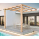 La pergola in legno lamellare Burgos che si appoggia alla facciata della tua casa per godere di un'estensione sul giardino e sulla terrazza ti permette di modulare la luce e il sole con una copertura a tua scelta.