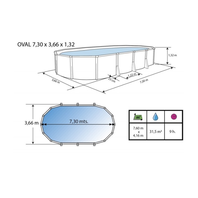 Piscina ovale alta 132 cm senza contrafforti. La piscina si inserisce perfettamente nel tuo giardino. Struttura in acciaio con profili metallici e schiumatoio completo.
