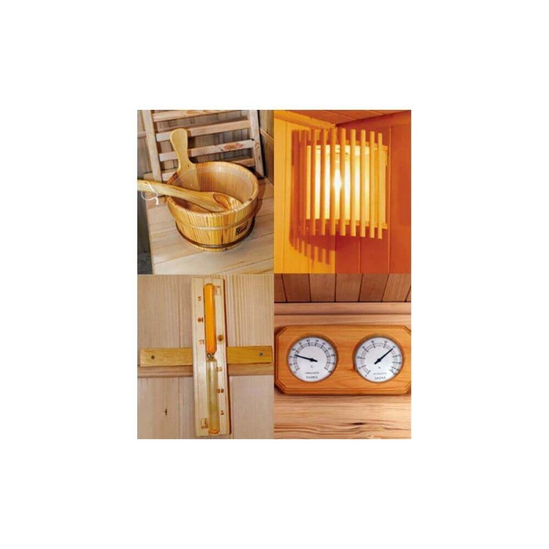 Per godere appieno le vostre sedute di rilassamento, un sacco di accessori in legno tipici accompagna ogni cabina: un secchio, un mestolo, un termometro e una clessidra (così come 20 Kg di rocce laviche).
