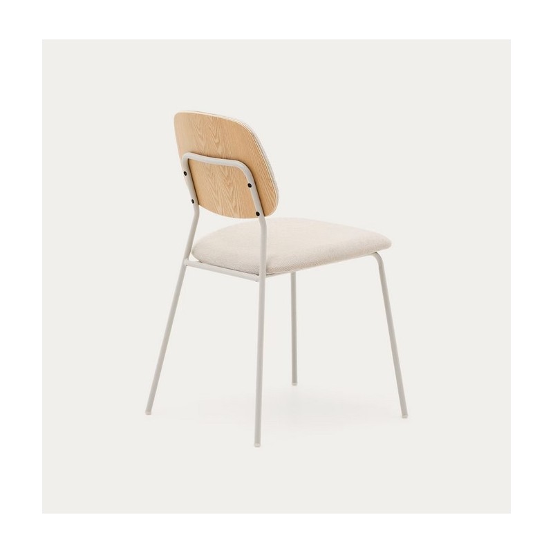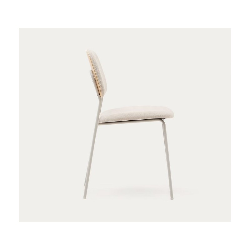 La sedia Linda di tendenza si caratterizza per il suo stile retrò con il suo design e i suoi materiali. La combinazione di impiallacciatura di rovere e acciaio è completata dal tessuto in ciniglia beige.