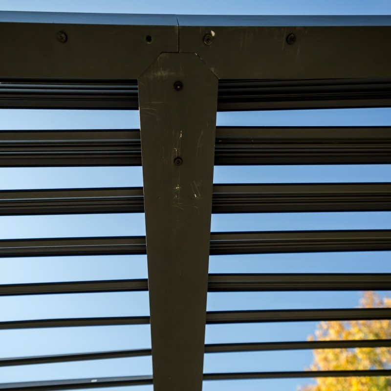 O telhado do mandril consiste em 78 lâminas de alumínio preto ajustáveis. Eles abrem e fecham manualmente e simultaneamente usando uma manivela. Eles podem abrir até 90 ° para controlar facilmente o brilho e o calor sob a pérgola.