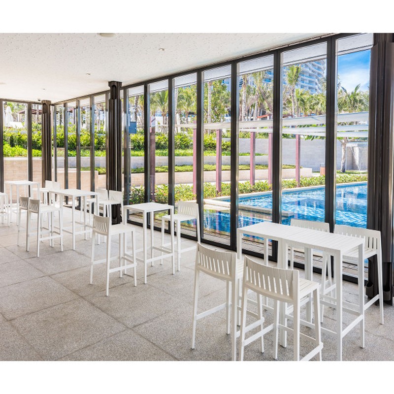 Composto por dois banquinhos altos e uma mesa alta, o conjunto de mesa Spritz e dois banquinhos nos lembram as cercas de madeira branca que alinham a praia.